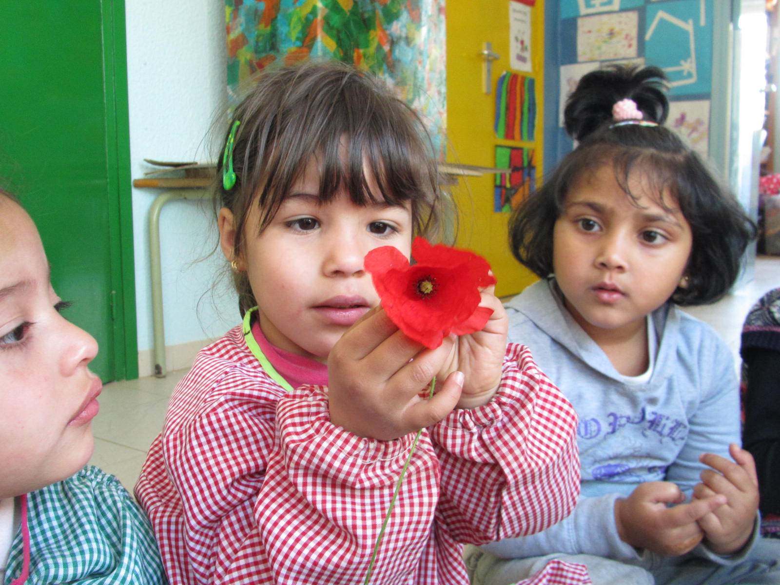 Han aprofitat per observar de molt aprop aquesta flor. . es vermella. . molt suau. . te una cosa negra a dins, . …