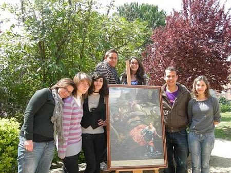 Tahís, Nerea,Judit, Kevin, Fran i Laura posen al costat d’un quadre (poster) del pintor italià Tintoretto, que representa la llegenda de Sant Jordi