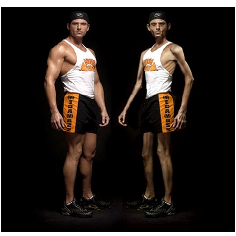 Igual que l’anorèxia, la vigorèxia es presenta per una distorsió de la imatge corporal. Afecta tant a dones com a homes, però al contrari que l’anorèxia, és més freqüent un trastorn masculí.