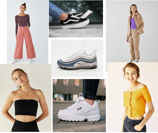 Ara parlarem de prendes que estan de moda, per exemple els tops de “paraula d’honor” els que no tenen tirants, pantalons “trencats”, militars amples, a quadres. Dessuadores simples o amb estampats. Mitjons alts normalment de marques d’esportives. Una altre peça que esta de moda son els pantalons de color beige.