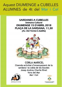 Diumenge 10 d’ABRIL, els alumnes de 5è varen participar, a la Plaça de la Sardana de CUBELLES, en una activitat sobre la sardana i la cobla dins del projecte del SardaTIC. Fou una activitat junt amb les escoles del nostre poble.