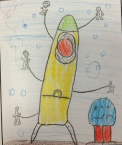 Barcelona, 27 de febrer del 2013. A la nau que va viatjar a Júpiter hi anaven cinc astronautes. Van arribar al planeta Júpiter i allà hi van trobar alguns alienígenes i se’ls van mirar de dalt a baix. Tenien tres ulls i dues boques. Ells volíen saber coses de les persones de la Terra, i de record els astronautes es van empotar un peix de colors!