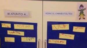 Una de les activitats que tenim tot el curs a l’aula és el “M’apunto”, on aprofitem un esdeveniment especial com pot ser una sortida, l’arribada d’un personantge…per apuntar-nos per fer aquella activitat. Cada nen/a que vol participar ha d’apuntar el seu nom en un tros de cartolina per poder fer l’activitat. El nom el posa cada nen/a sol/a sense ajuda i a mida que va passant el curs el nom cada cop és més entendible. Als infants els fa molta il·lusió veure el seu nom en la graella i això els fa motivar-los per fer-ho el més bé possible.
