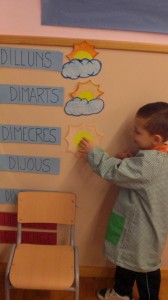 Quin temps fa avui? els encarregats/des del temps després de mirar per la finestra el temps que fa decideixen amb la resta de la classe si fa: sol, sol i núvol, pluja o núvol. I col·loquen el cartellet en el dia de la setmana corresponent. Això els ajuda a situar-los en el temps i saber quin dia és.