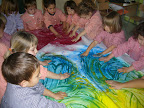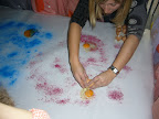 Hem posat un paper d’embalar de punta a punta, sobre les taules i amb ous, sucre i pigments dels colors base ( blau, magenta i groc), hem fet un “pastichu” tot barrejant els diferents components.