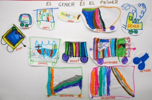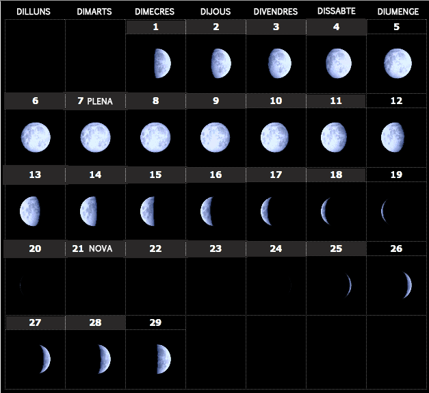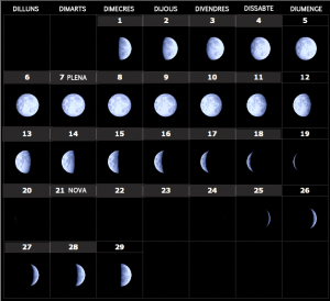 En el Quadern Viatger tenen una graella semblant a aquesta on cada nit durant el mes de febrer han de dibuixar quina lluna es veu per després a la classe compartir-la amb els companys. Així van aprenent que la lluna varia i passa per unes fases.