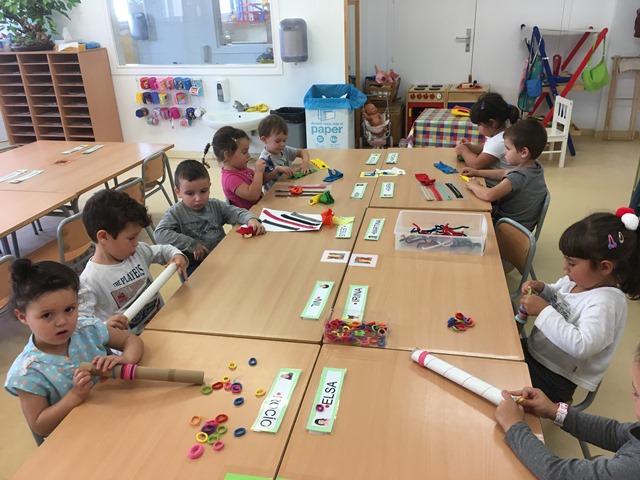 A P3 és bàsic el treball de la motricitat fina,cal agafar força a les mans i als dits per poder més tard agafar de manera adequada el llapis,els colors,… i poder fer un traç com cal, és per això que cada setmana treballem de manera específica i diem que fem “dits fins”. les activitats són variades;obrir i tancar candaus amb les claus,posar gomes del cabell als tubs,agafar amb les pinses els pom poms per classificar-los,cordar i descordar botons i cremalleres,plastelina,encaixos,enfilar,enganxar gomets,….bé i tot el que us pogueu imaginar a partir del joc que facilita el desenvolupament de les habilitats motrius.
