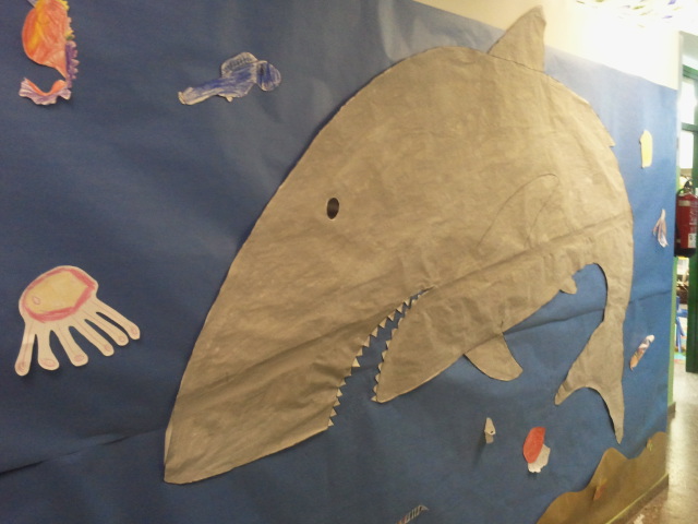 Hem ambientat els passadissos de l’escola amb elements del mar, i just a la paret de la nostra aula hem fet entre tots els nens i nenes un tauró ben gros que ens fa companyia!