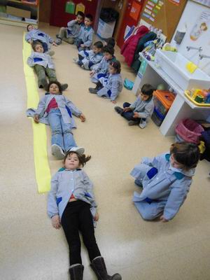 Sabeu que els dofins poden arribar a fer 4 metres de llarg. Un dia vam comparar la llargada d’un dofí amb la nostra i amb alguns objectes de la classe. La línia groga fa quatres metres. Mireu què vamb fer: