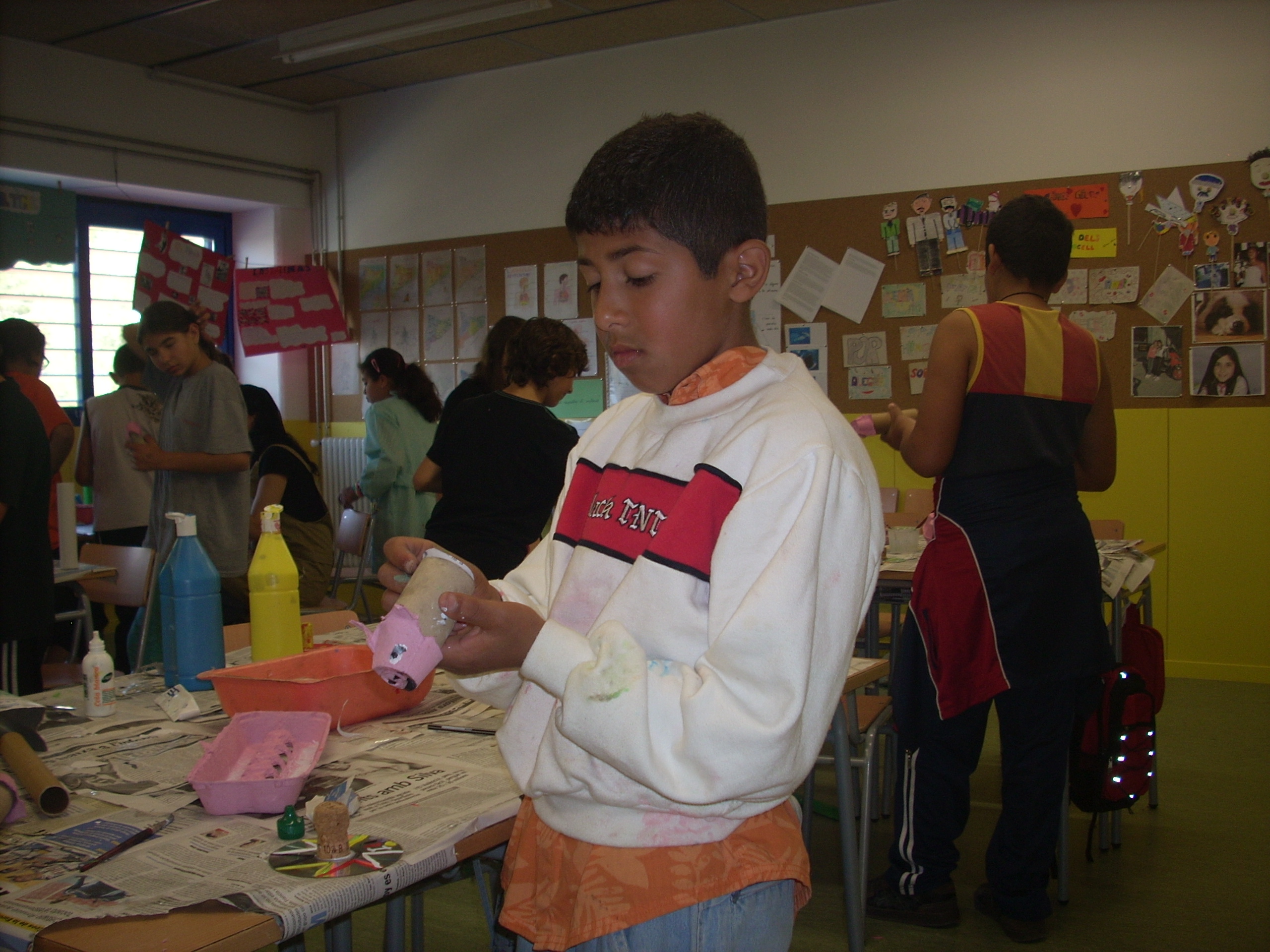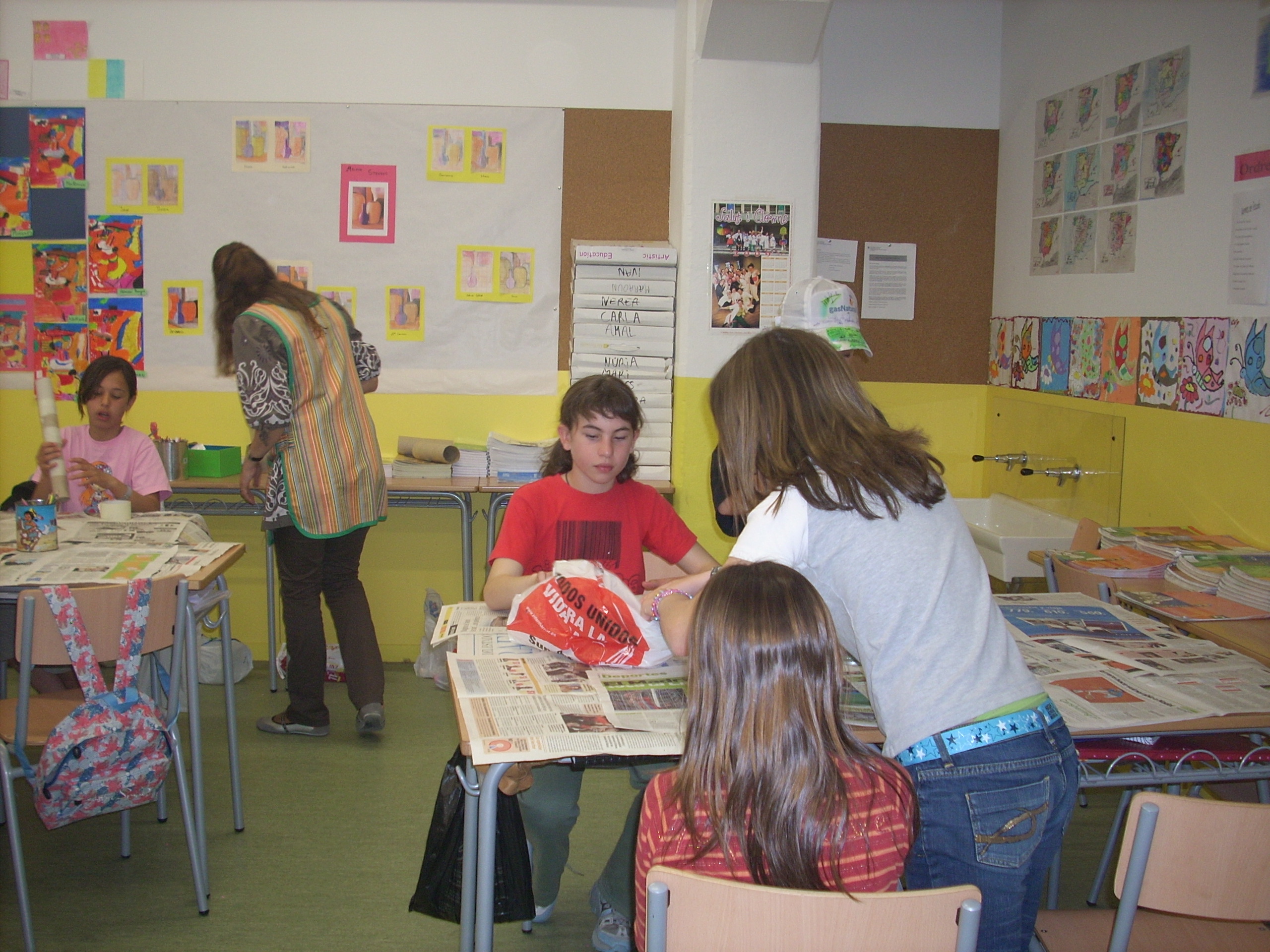 Hem fet una foto als nens de 5è A ,estaven fent un moneder de cartró,un porc amb paper reciclat i una baldufa..També hem anat a dos classes de nens d’infantil, una classe jugava amb plastilina i l’altre estava pintant.