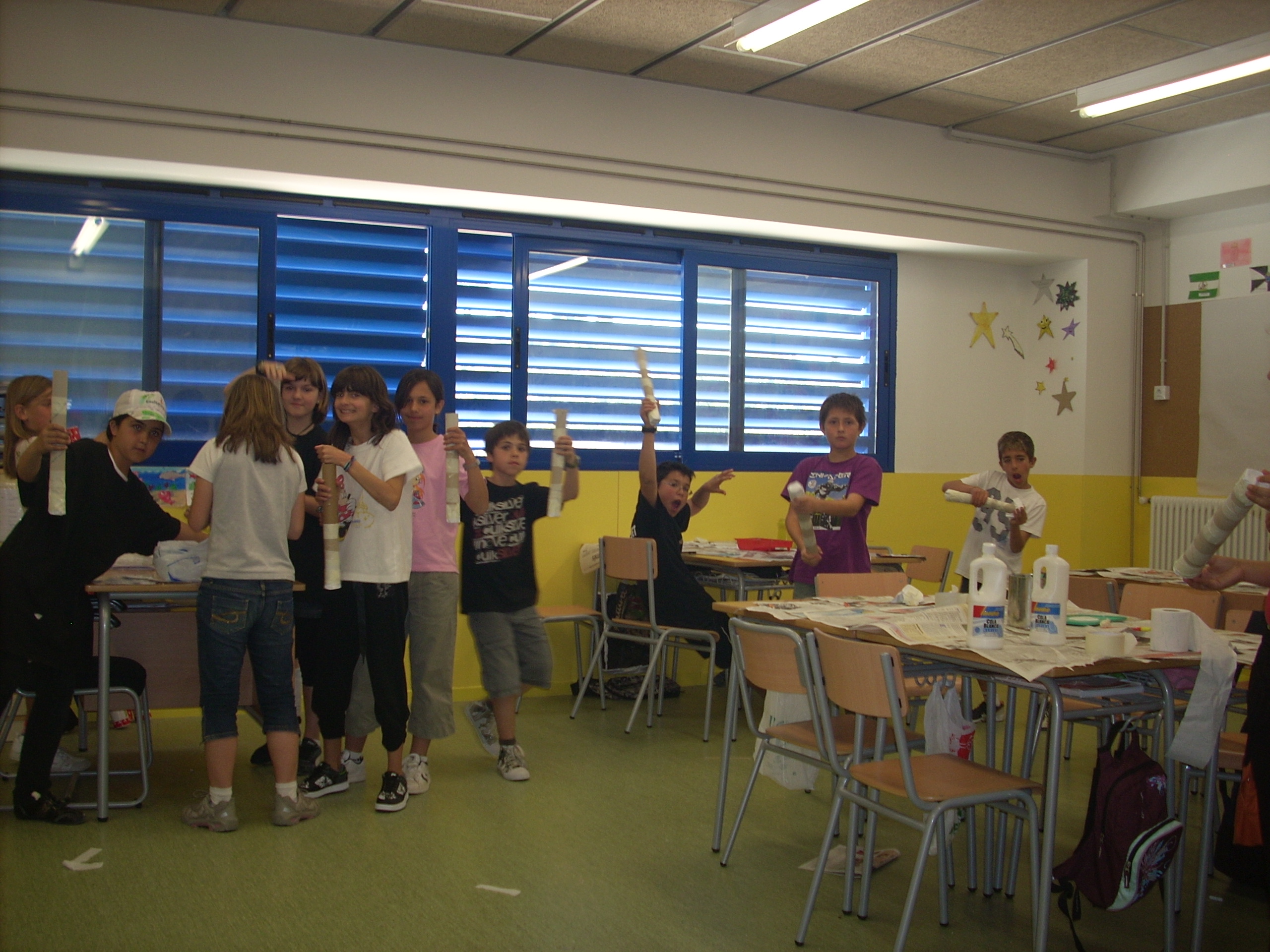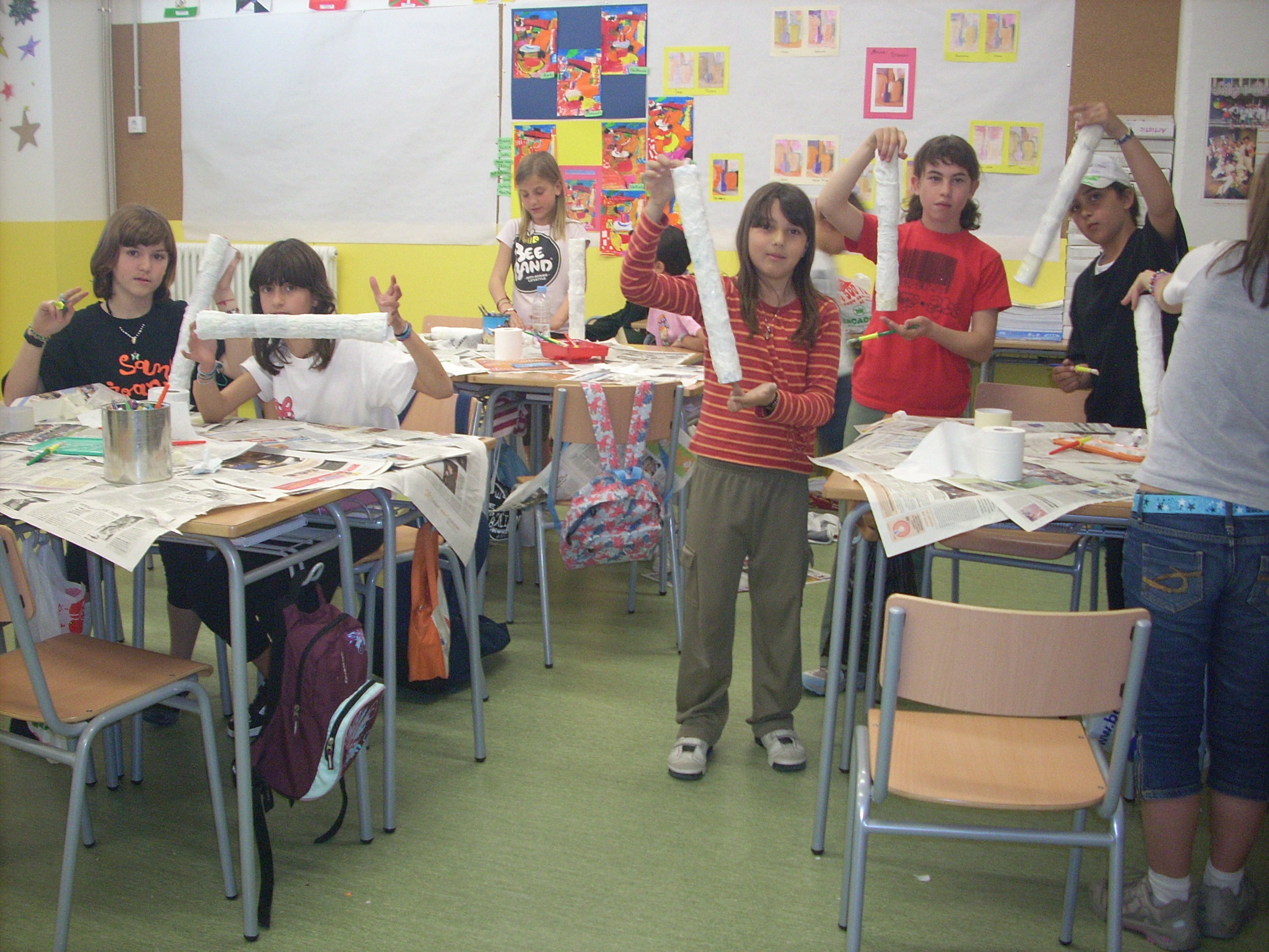 Hem pujat a primària a la classe de la Cristina que estaven terminant un pal de pluja am tubs de wàter forrat de paper.