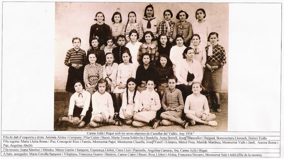 La Mercè Garrós i Sampere va ser de les primeres alumnes de la nostra escola. Una de les seves mestres va ser Carme Julià i Riqué, la primera directora que va tenir l’ Emili Carles-Tolrà.  La Mercè té molts records d’aquella època: l’escola de nenes, les mestres, les bates, aquells pupitres, els jocs al pati, l’enciclopèdia, les cançons, els càstigs, els canvis … Ja han passat uns quants anys però la Mercè ha anat recordant i recollint els noms de totes les companyes  d’aquell llunyà curs del 1934 i, molt amablement, ens  ha deixat aquesta imatge històrica. 75mil gràcies! Aquests bocins d’història de l’Emili ens ajuden a reconstruir,  conèixer i estimar una mica més la nostra escola.
