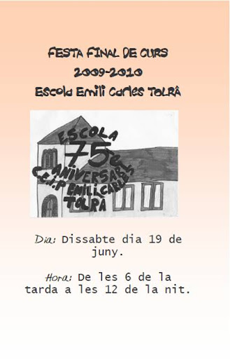 Dissabte, a partir de les 18h,  celebrarem la festa de final de curs que suposarà la cloenda del actes del 75è aniversari.  Hi ha prevista una colla d’activitats: exposicions,  ball de plaça,  cantada de la Coral Sant Esteve, comiat a la canalla de sisè, presentació del llibre dels 75, ball de bastons, tabalers, cercavila, el sopar, ball amb el Bufanúvols
