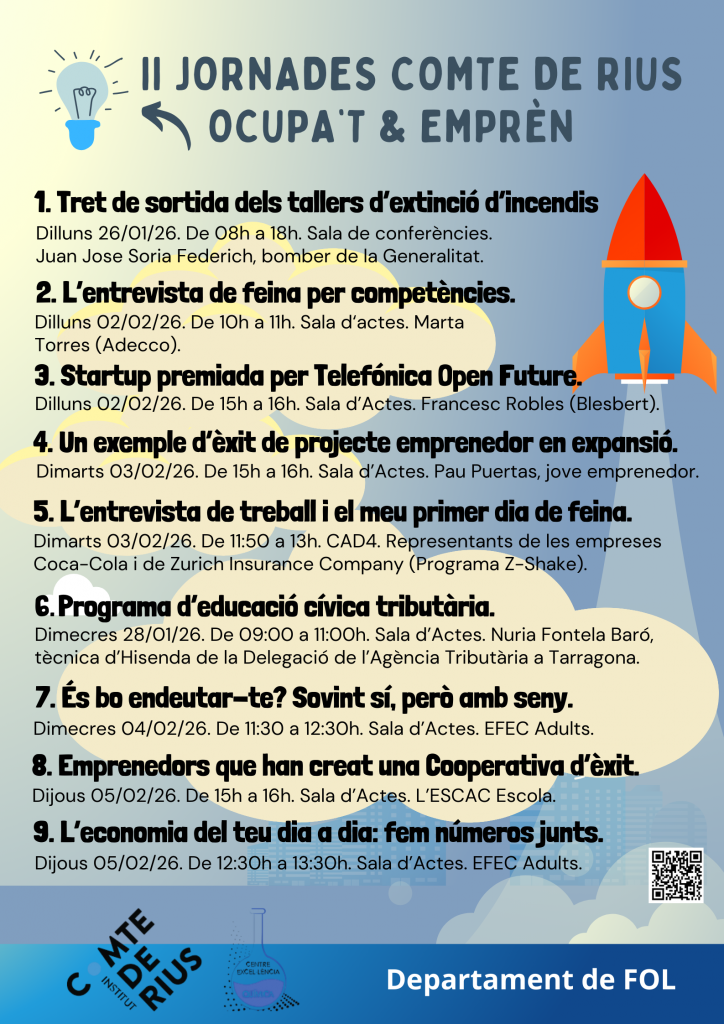 Organitzem les nostres pròpies jornades per a la cerca d’ocupació i el foment de l’emprenedoria durant la Setmana de Sant Joan Bosco, que aquest curs acadèmic tenen lloc del 26 al 30 de gener de 2026.