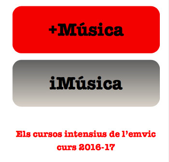 S’ha obert la inscripció corresponent al 2n trimestre dels tallers intensius iMúsica i +Música. Es tracta d’una oferta adreçada a alumnes tant de dins com de fora de l’escola que consisteix en vuit sessions de materies musicals diverses que poden anar des de la informàtica fins a la iniciació a algun instrument, reeducació de la veu o classes de reforç per alumnes que estan preparant proves específiques. També és una bona manera de cursar un instrument complementari ja que des de l’escola actualment és pràcticament impossible. El + Música estaria destinat a alumnes de 5è i 6è de primària i el iMúsica a alumnes de secundària i batxillerat. La inscripció es fa via formulari electrònic que trobareu en aquest mateix web. Les classes comencen el 30 de gener.