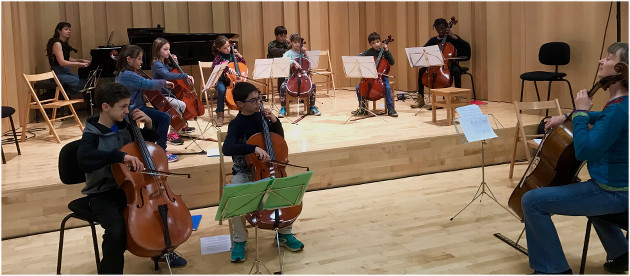 Alumnes de NE de violoncel preparant, aquest dissabte, el conte musical La crida de Noè