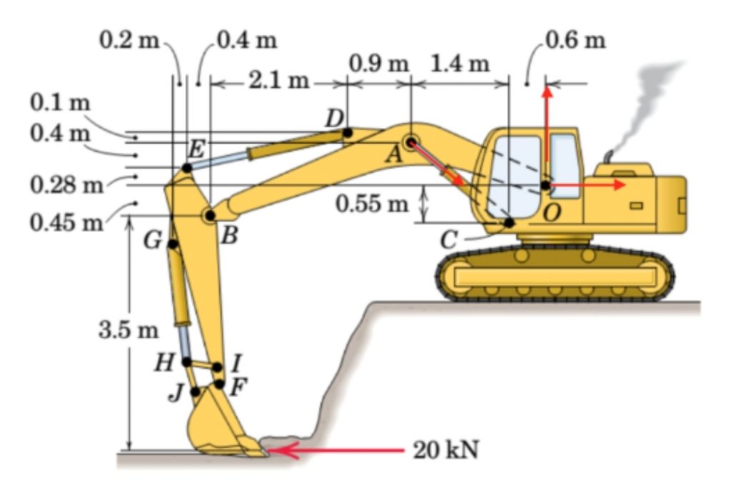 horitzontal de $20\,\text{kN}$ contra el sòl. El mecanisme està format per dos braços