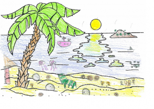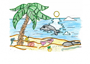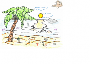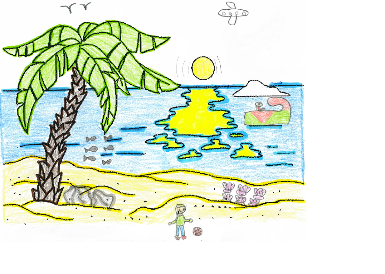 This place is an island. In the island there is sand and there is a palm tree with five coconuts. There is a pineapple, a scorpion, a shell and one boy. Also there are two stones. In the sea there are some fish. There is a dolphin and a big rock with an unusual form. High in the sky there is a bird. It is not big and not little. Allso there is the sun and some clouds. The clouds are white, the sun orange and yellow and brown bird flying in the sky. I love this island!!!!!