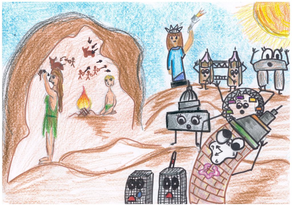 But he makes a mistake, and he and all the other monuments end up in the Stone Age!