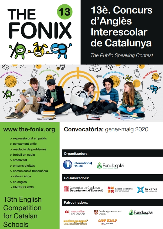 13è. Concurs d’Anglès Interescolar de Catalunya (gener -maig 2020). The Public Speaking Contest. THE FONIX, és un concurs escolar d’expressió oral i en públic en llengua anglesa, dissenyat per afavorir l’aprenentatge d’aquest idioma dels alumnes de primària, secundària i batxillerat. La participació en el concurs es fa exclusivament a través del centre on l’alumne està matriculat i la participació és totalment gratuïta. Inscripcions a partir del dia 6 de novembre del 2019.