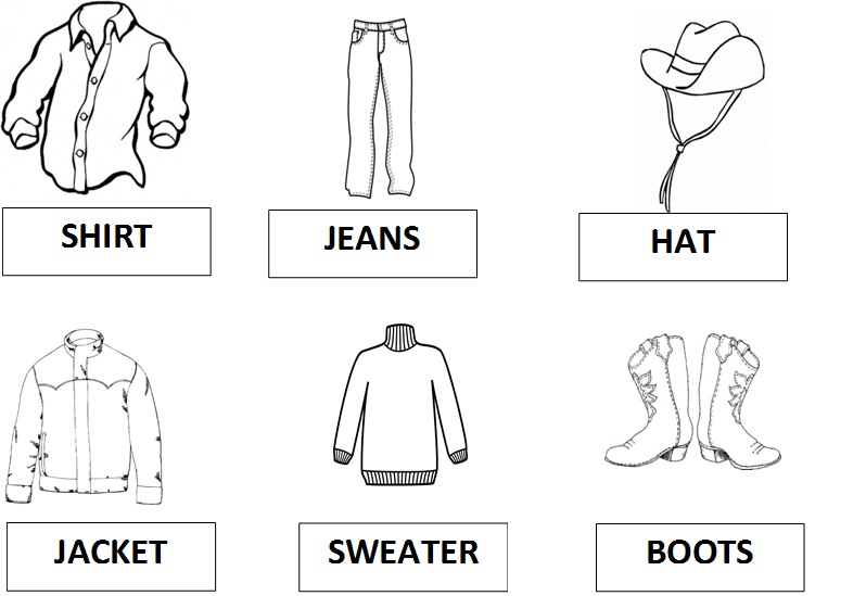 HEM D’ESCRIURE I’M WEARING … (JO PORTO…) PRIMER EL COLOR I DESPRÉS EL NOM DE LA ROBA. AQUÍ US POSO UN ALTRE EXEMPLE, AMB ELS NOMS DELS COLORS I DE LA ROBA DE COWBOY I COWGIRL.