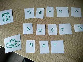 NO CAL QUE L’IMPRIMIU, PODEU DIBUIXAR LES PECES DE ROBA DUES VEGADES I RETALLAR-LES. RECORDEU QUE QUAN BUSQUEM LES PARELLES, CADA VEGADA QUE GIREM UNA TARGETA HEM DE DIR EL NOM EN ANGLÈS. SI NO RECORDEU EL NOM, CAP PROBLEMA, TORNEU A MIRAR EL VÍDEO ON DIC EL VOCABULARI.