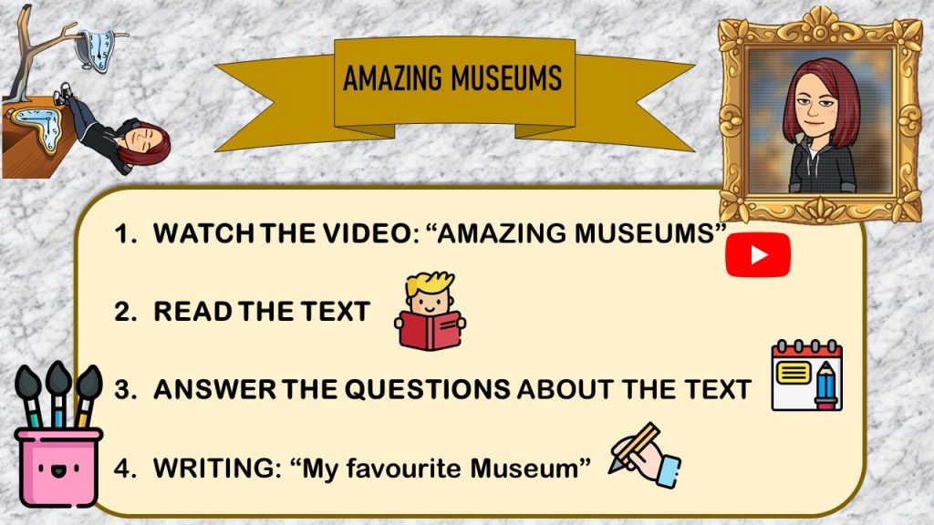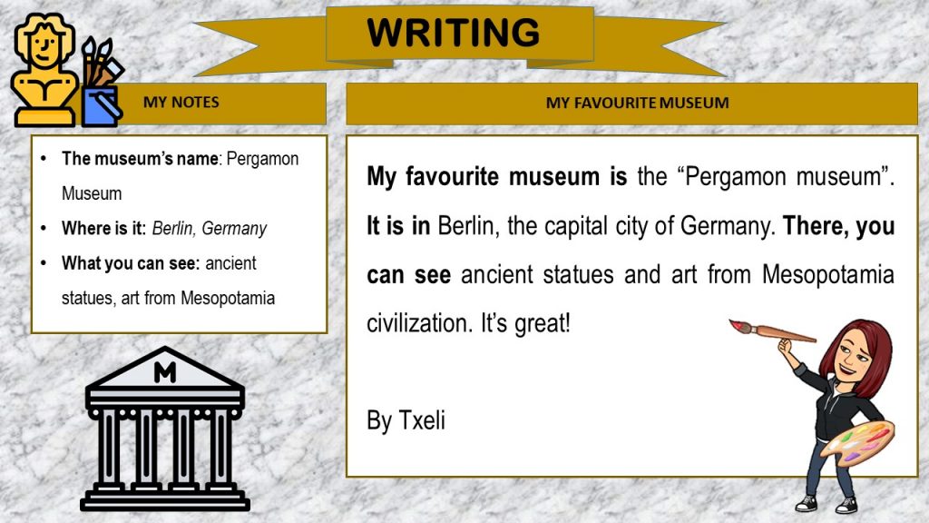 LLegeix el model sobre el writing, fes primer l’apartat MY NOTES i després el WRITING ” My favourite museum”. Segueix el model canviant la informació.