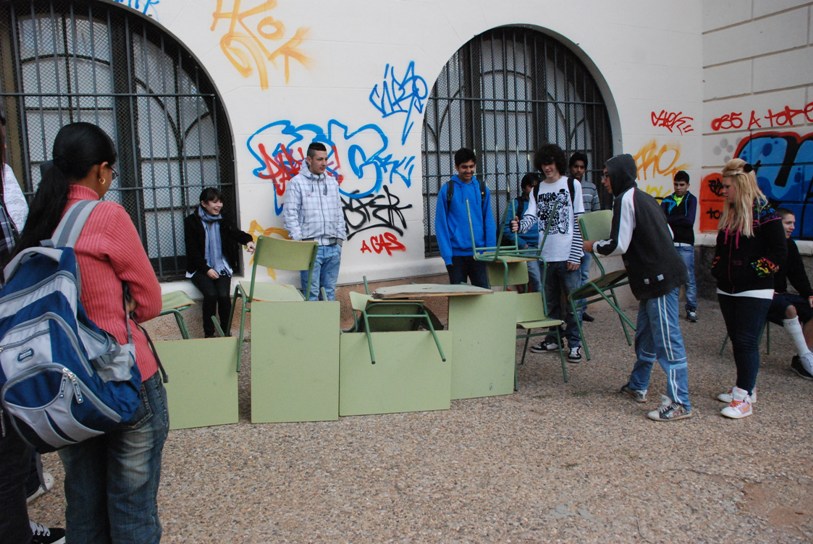 Els alumnes i la Margarita Andreu assagen possibles estructures per espais afegits. Amb tires de papers de diferents tipus i organitzats per petits grups, construeixen les maquetes dels esquelets dels espais imaginats.
