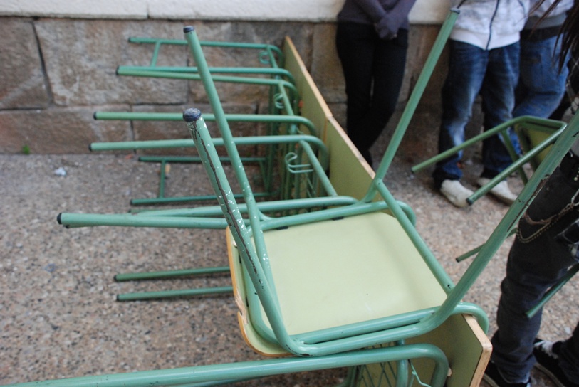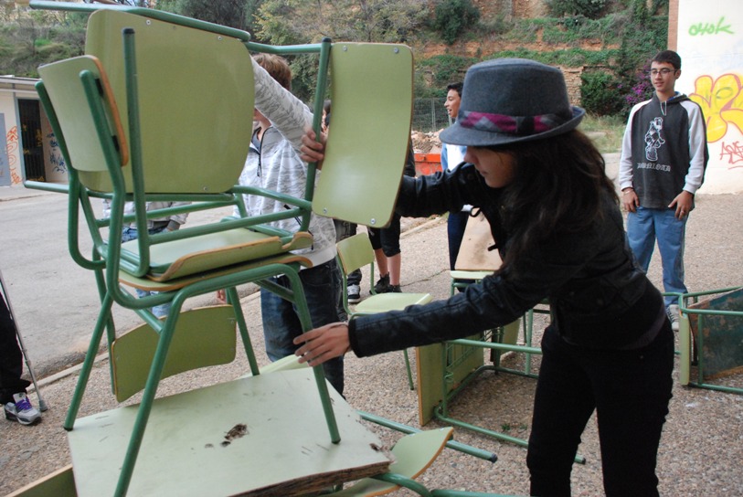 A l’Institut Joan Brossa, després d’algunes performance de Josep-Maria Balanyà amb la seva escultura ‘Cinco exteriores k cuelgan’, són els alumnes qui percudeixen amb diverses peces metàl·liques i objectes sonors.