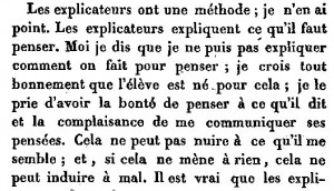 [revolució actual en la ment de tot docent: suportar la pregunta “com em sento quan sé que l’alumne està aprenent per ell mateix, i deixo en les seves mans l’ús de la seva pròpia intel·ligència” és el millor indicador d’autoavaluació; em resitua en la crisi anàloga a la viscuda per Jacotot – tuvo que exiliarse en tierras flamencas y desempeñar su función de maestro con alumnos cuya lengua desconocía absolutamente.]