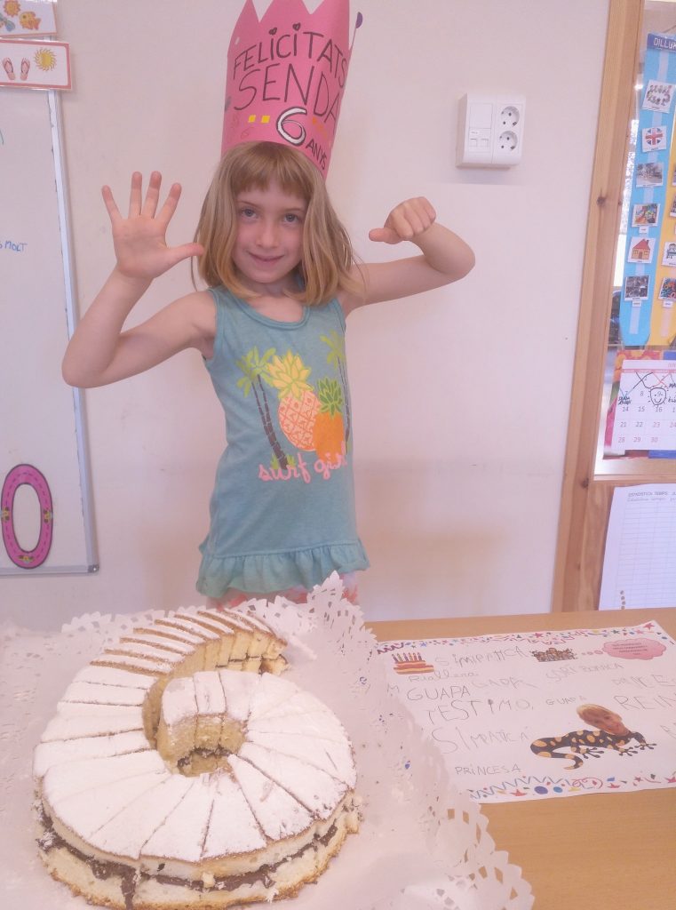 LA SENDA ENS HA CONVIDAT A ESMORZAR UN PASTÍS BONÍSSIM DE PÀ DE PESSIC FARCIT AMB FORMA DE 6!! ENS HA ENCANTAT!! NOSALTRES LI HEM REGALAT EL DIPLOMA DE LES SALAMANDRES PERSONALITZAT AMB PARAULES BONIQUES QUE PENSEM D’ELLA I 6 PETONS VOLADORS! A MÉS, HEM BALLAT I CANTAT DIFERENTS CANÇONS!!
