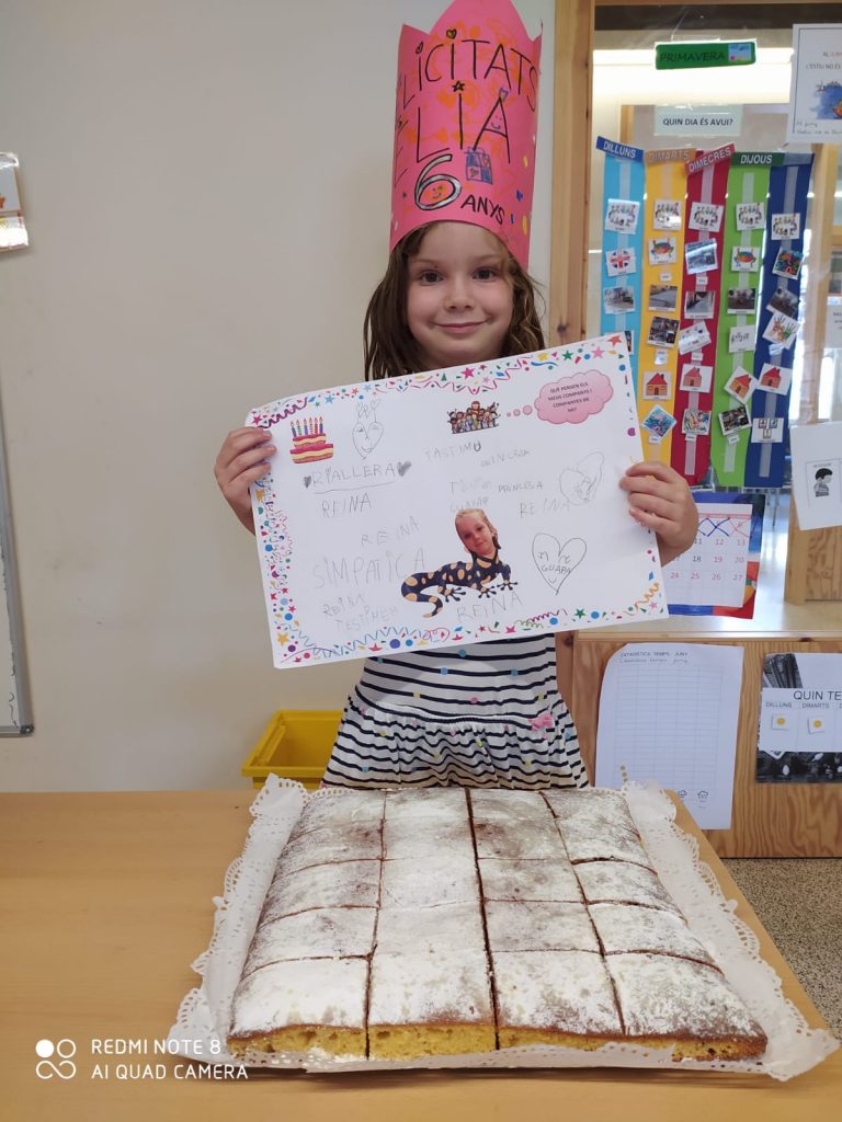 L’ÈLIA ENS VA CONVIDAR A ESMORZAR UN PASTÍS DE PA DE PESSIC DELICIÓS I NOSALTRES LI VAM REGALAR EL NOSTRE DIPLOMA PERSONALITZAT AMB TOTES DE PARAULES BONIQUES QUE PENSEM D’ELLA! TAMBÉ LI VAM LLENÇAR 6 PETONS VOLADORS PLENS AMOR I AFECTE! A MÉS VAM BALLAR I CANTAR CANÇONS D’ANIVERSARI!!