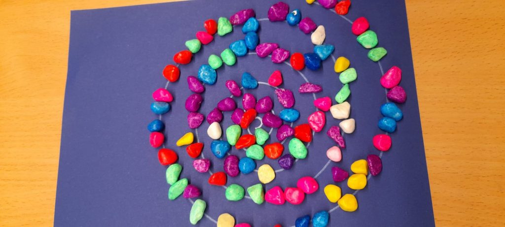 A la classe de les salamandres seguim fent grafisme. Aquest cop, hem fet l’espiral. I com l’hem fet? Doncs, de moltes maneres. Amb el nostre cos, amb guixos, amb cordes, amb peces de construccions, amb pedretes, dibuixant-lo….