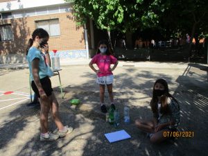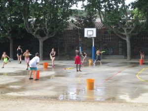 Vam fer la xeringada al pati de l’escola. Hi havia diverses galledes plenes d’aigua amb colorant. Portàvem unes pistoles que anàvem omplint d’aigua i ens l’anàvem tirant entre nosaltres. Després ens vam mullar amb els aspersors i finalment ens vam posar al solet per assecar-nos.