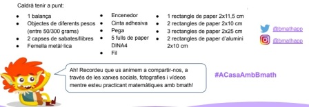 AcTRIvitats: Els nou quadres del museu 3 Bmath (15 minuts diaris) ACTIVITAT OPTATIVA: bmatheroesCom cada setmana, el Bernat i el Jordi ens portaran un nou experiment per aprendre i divertir-nos! I si voleu començar a preparar el material, us deixem el llistat: