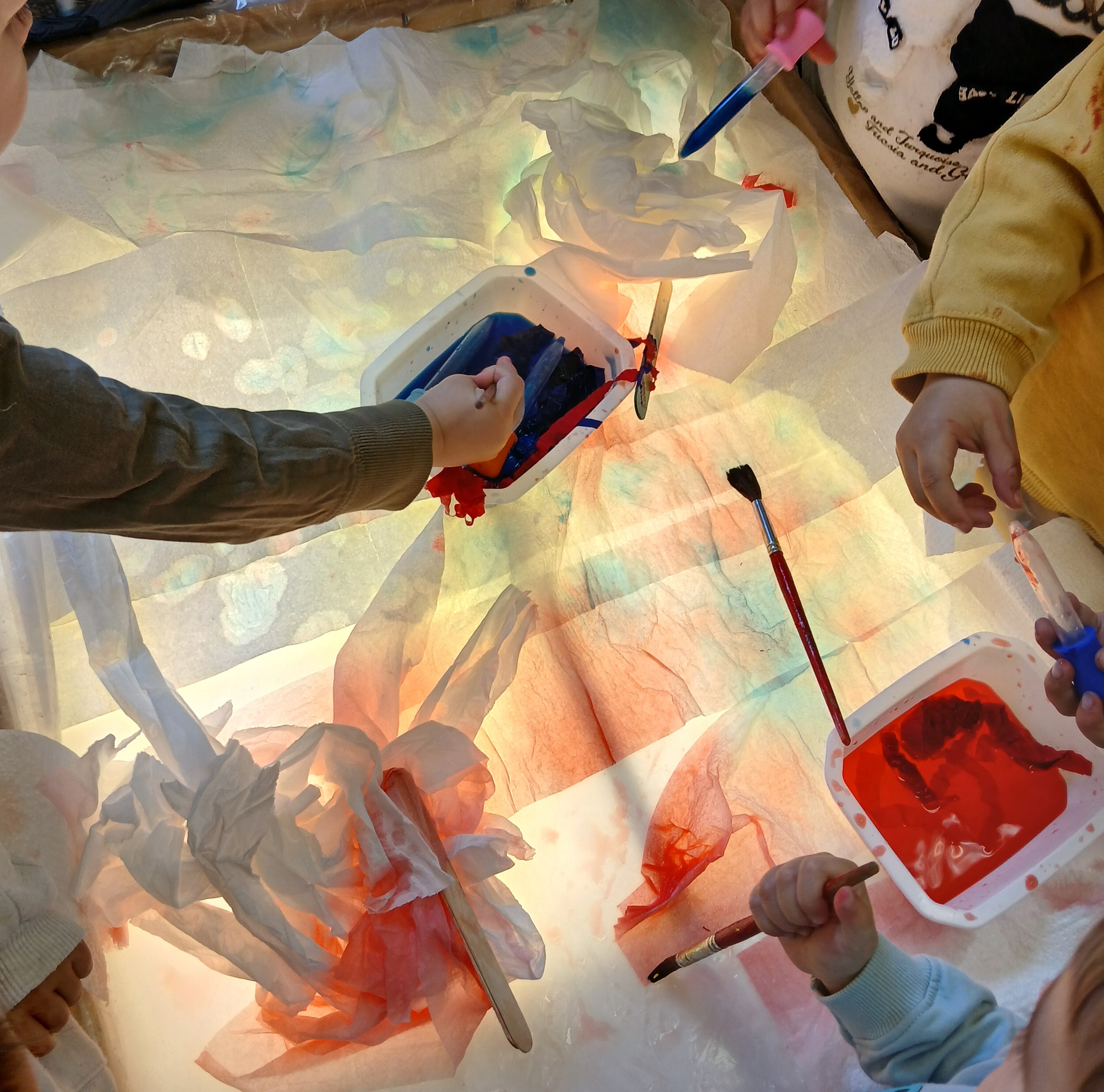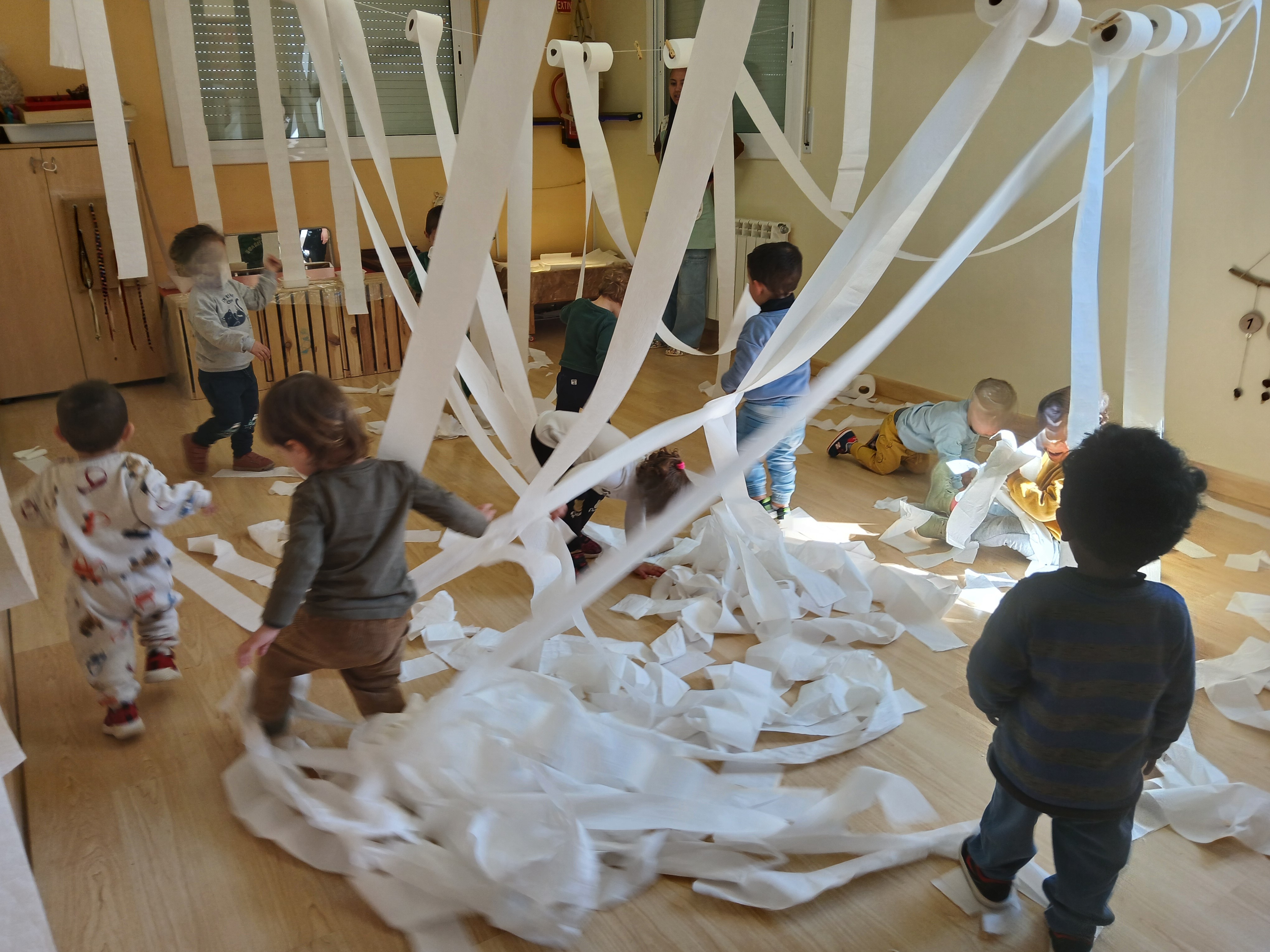 Tot aquest aprenentatge des del joc, la descoberta i l’emoció que suposa trobar un espai ple de diferents opcions motrius: coordinar mans per treure tot el paper del cartró, fer rodolar els rotllos de paper per terra, ballar lliurement amb paper fent diferents formes i moviments, amagar-nos i gaudir de l’element sorpresa en aparèixer a sota d’una muntanya blanca i suau, esquinçar el paper amb els nostres dits potenciant el to muscular de les mans, fer boles o muntanyes per tirar-les cap amunt en un entorn de seguretat i tranquil·litat, tenyir el paper amb pipetes i pinzells utilitzant els dits polze i índex preparant la mà per l’escriptura ( necessitat de fer la pinça correctament amb els dits polze, cor i índex), etc.
