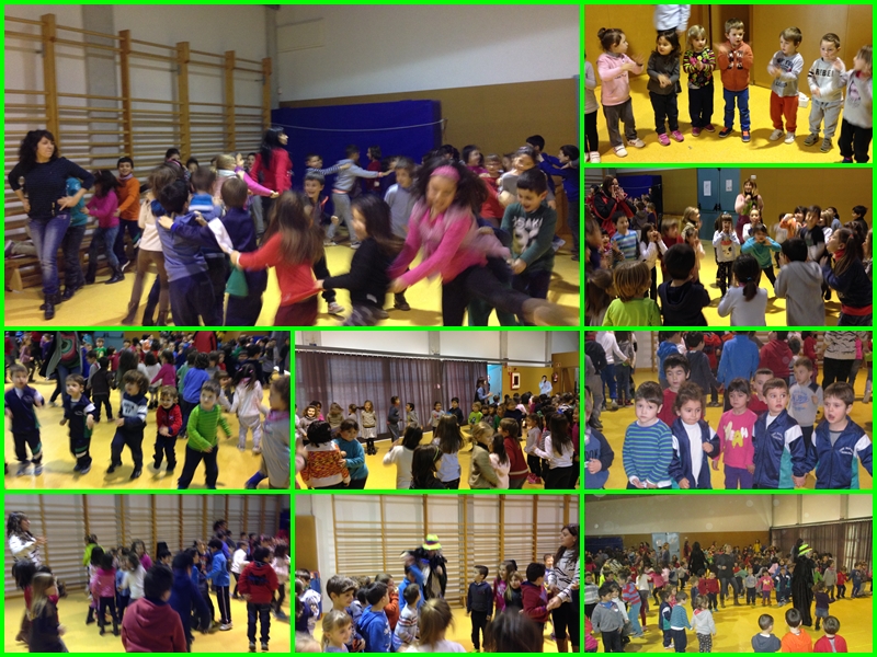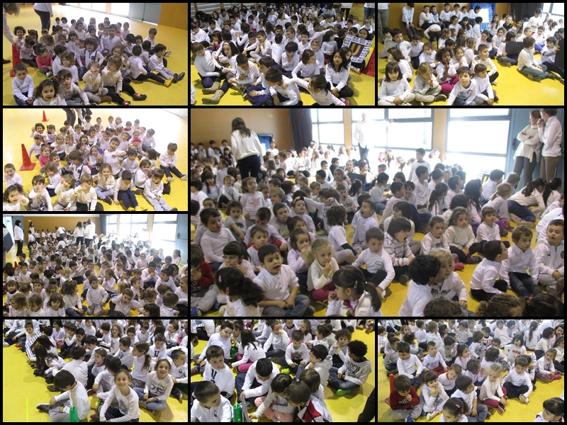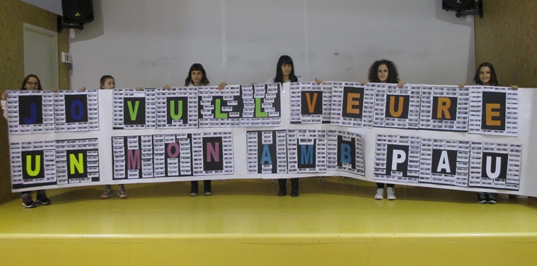 Tots junts al gimnàs de l’escola varem construir en un mural la frase “jo vull veure un món amb pau”on estaven les fotos dels ulls de tots els alumnes, mestres i personal de l’escola, amb desitjos de pau. Per acabar tots junts vam cantar la cançó “Quin món tan bonic”