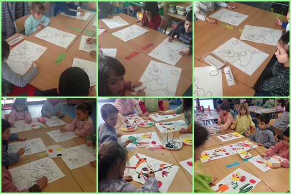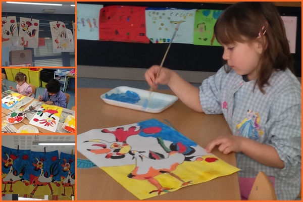 A l’obra “Le coq” de Joan Miró els nens havíen de dibuixar la cresta, les plomes i les potes del gall i pintar amb pintures aquesta divertida obra.