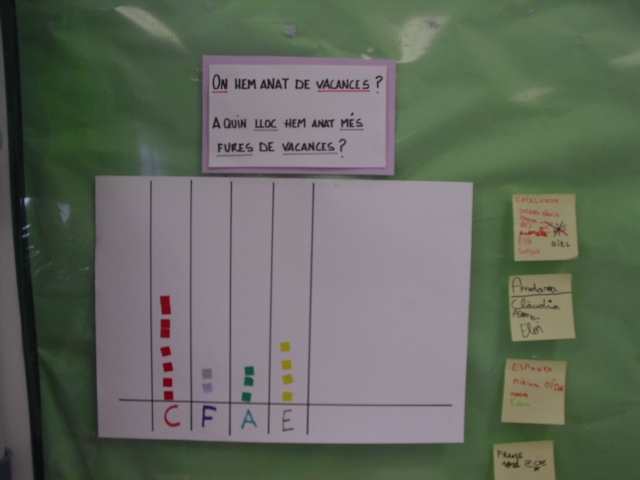 Volíem saber a on havíem estat de vacances i quin lloc era el més visitat. Hem fet un gràfic amb el propi cos i, després, amb paper. El lloc més visitat ha estat Catalunya.