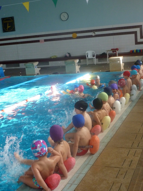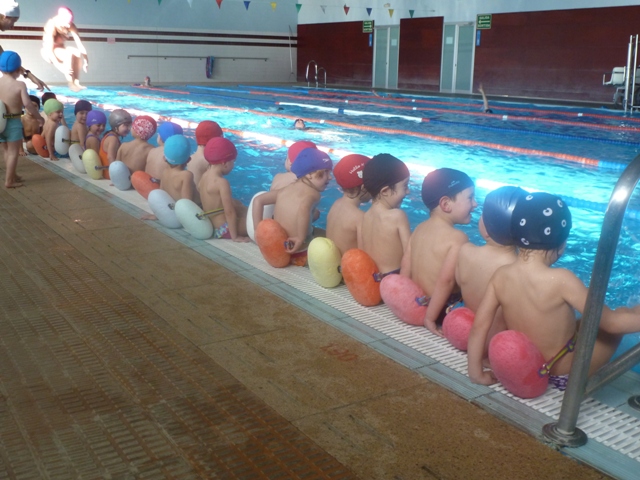 Els dimecres, des d’aquesta setmana, els nens i nenes de la classe dels Conills anem a la piscina! El primer dia va anar molt bé: l’autocar, desvestir-nos, posar tota la roba ben posada, el barnús, les xancletes i… cap a l’aigua!