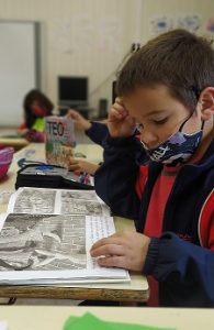 Aquest any tenim una petita biblioteca on gaudim de les estones de lectura diària. Hi ha uns pufs i uns banquets que desinfectem cada cop que ens asseiem. Com no hi cabem tots els nens i nenes de la classe, els de primer van un dia i els de segon un altre. Allí podem trobar llibres amb català i castellà, amb lletra de pal, lligada i d’impremta.