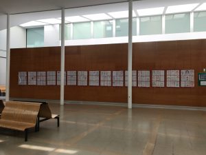 Comencem amb un clàssic: l’Exposició d’Autoretrats dels alumnes del curs passat, al vestíbul de l’hospital.