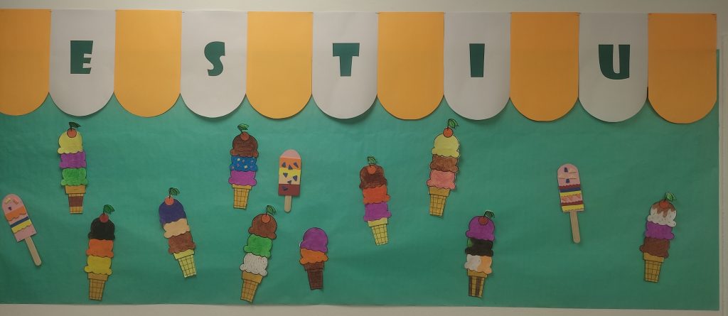 Com sempre avui, pensem en aquells infants que hauran de passar uns dies ingressats durant l’estiu, a la planta de pediatria. Els desitgem una ràpida recuperació. I com que nosaltres no hi serem fins al proper curs, els hi deixem un mural amb uns gelats molt fresquets, pesrquè no perdin de vista que aviat tornaran a disfrutar de les seves vacances.