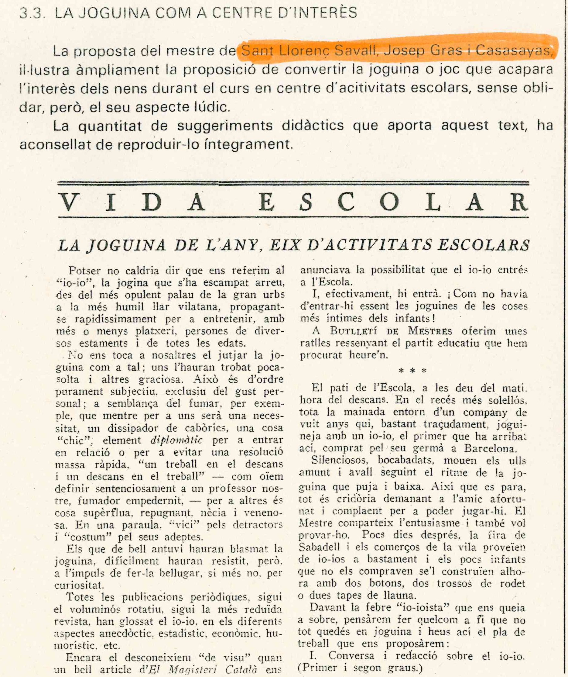En aquest article publicat pel mestre Josep Gras l’any 1934 ja es pot veure el que marcaria la línia pedagògica del nostre centre. L’activitat del ioio tenia un alt significat per l’alumnat del moment, un joc que provocava i estimulava l’aprendre i el saber més. Era l’inici del que, en aquests moments, vertebra la nostra línia d’escola: els projectes de treball.