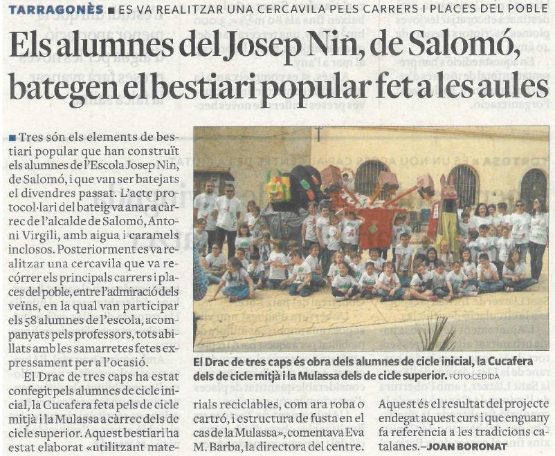 Divendres vam donar per finalitzada la setmana cultural. Al matí ens van visitar tres membres de la colla de diables de Constantí. A la tarda vam fer una cercavila pels carrers del poble i després, tots plegats, vam gaudir d’un berenar de germanor.