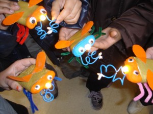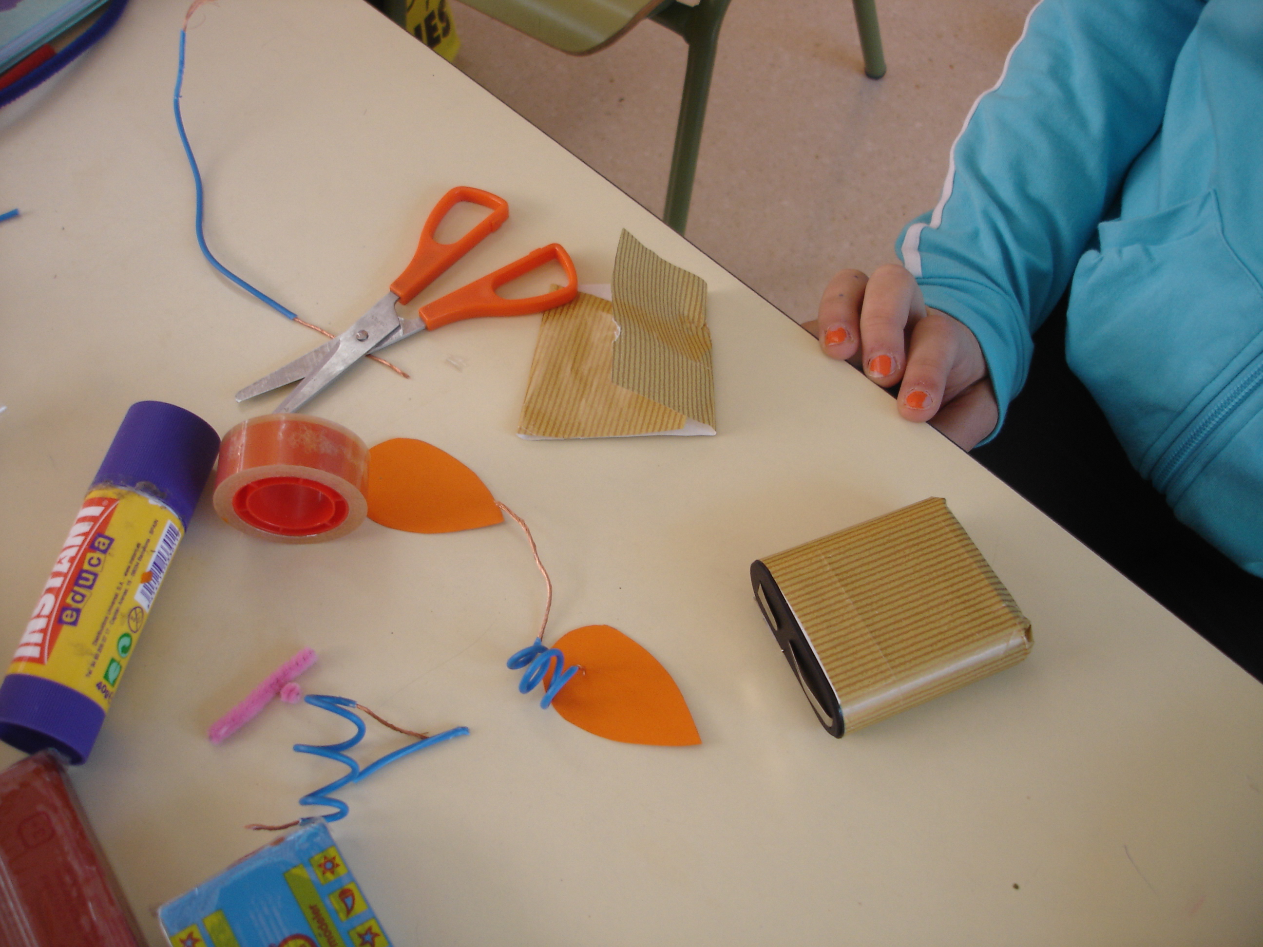 La manualitat següent va lligada amb l’assignatura de Medi, ja que vam aprendre que alguns materials són conductors de corrent elèctric i d’altres no. Així doncs, vam fer un petit insecte detector amb l’ajuda d’una pila, una bombeta i cable. Com que el circuit queda obert, cada cop que amb les dos antenes toca un material conductor, s’i il·lumina el nas (la bombeta).