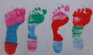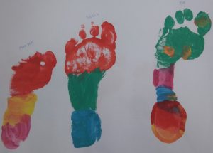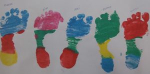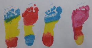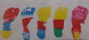 Després, hem pensat que seria bonic estampar els nostres peus, des del més petit fins el més gran. Ha quedat una tira de peus ben colorida i hem pogut observar les diferents mides de peus que hi ha a la classe.