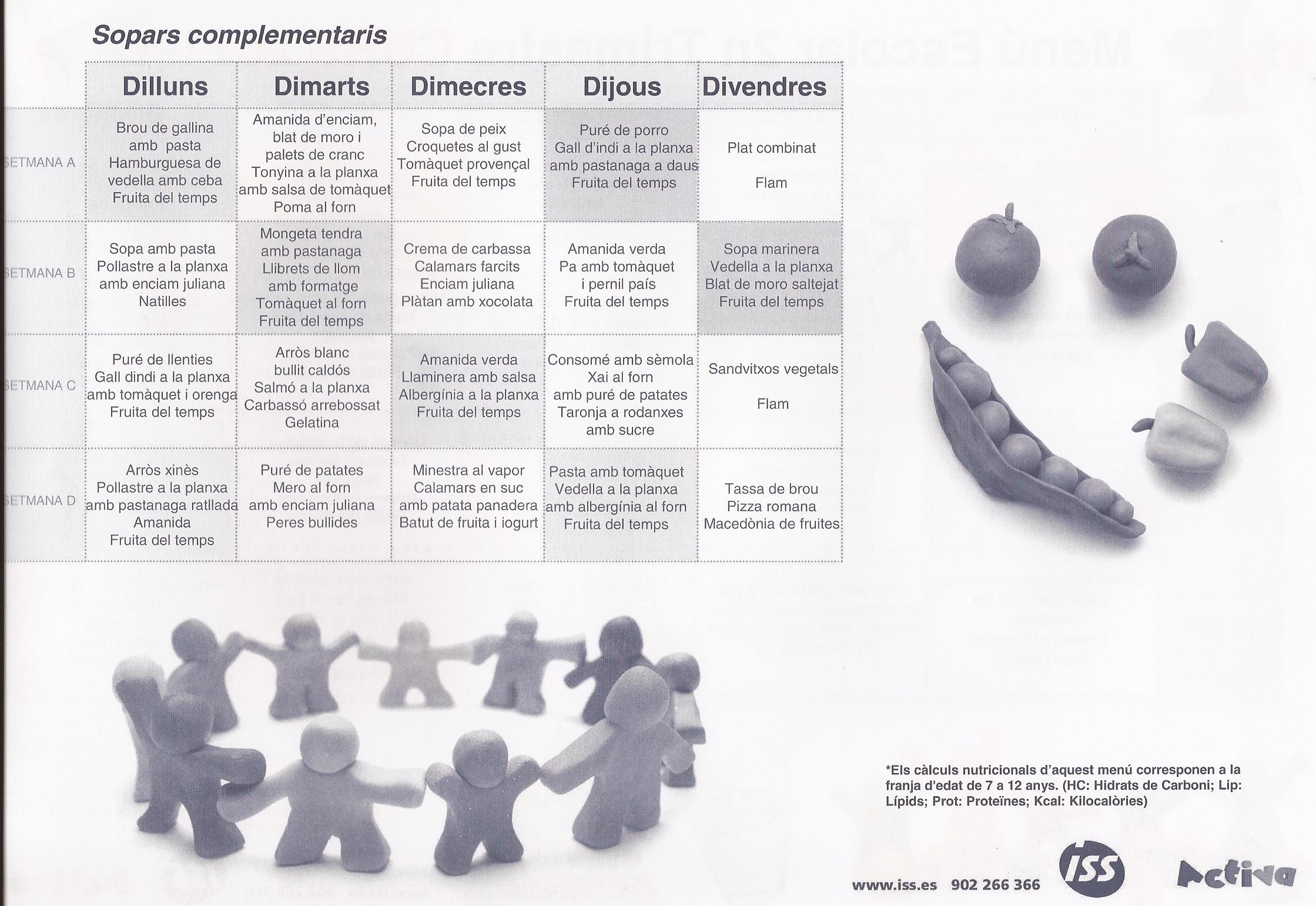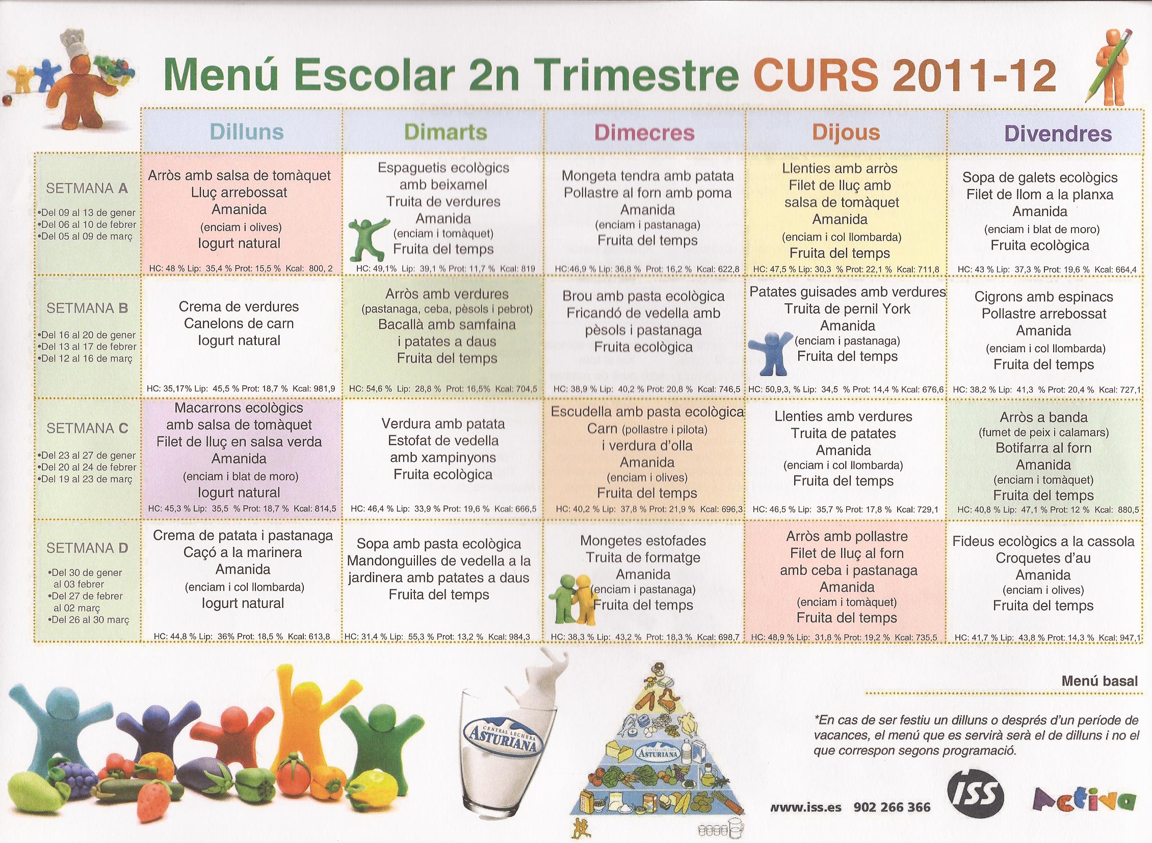 Menús segon trimestre Leave a reply Us presentem el menú escolar amb l´alternativa de sopars complementaris per aquest segon trimestre del curs escolar 2011-2012. Bon profit!!