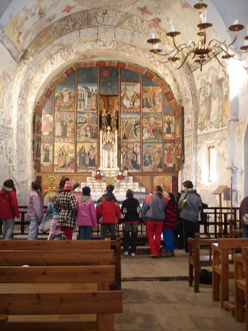 El dimarts pel matí vam anar a l’església de Sant Just i Sant Pastor de Son. Ens van explicar la forma de l’església i de quin estil era. Després vam veure el retaule i la Neus ens va explicar moltes coses sobre aquest. Des d’allà veiem les muntanyes nevades i feia molt de fred. Ah! També va nevar una miqueta. Vam tornar a la casa de colònies per un camí medieval.