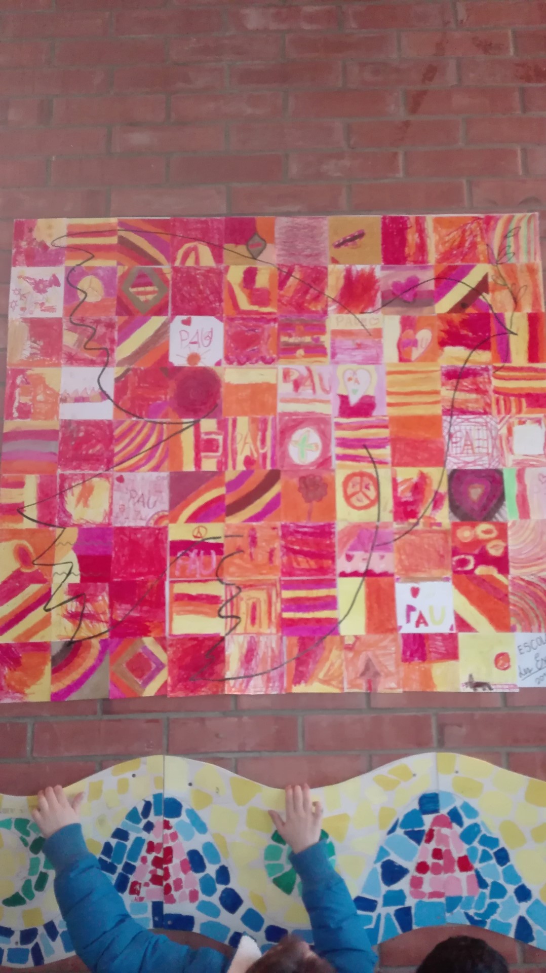 A la tarda tots junts vam fer un mural amb els quadres que havíem pintat al matí i plegats, vam poder construir el colom de la pau. colomg